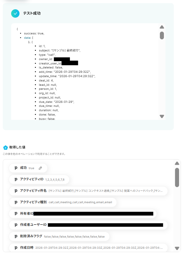 - 最後に、オペレーションでPipedriveの「アクティビティを更新」アクションを設定し、前のステップで取得した情報をもとにアクティビティを更新します。