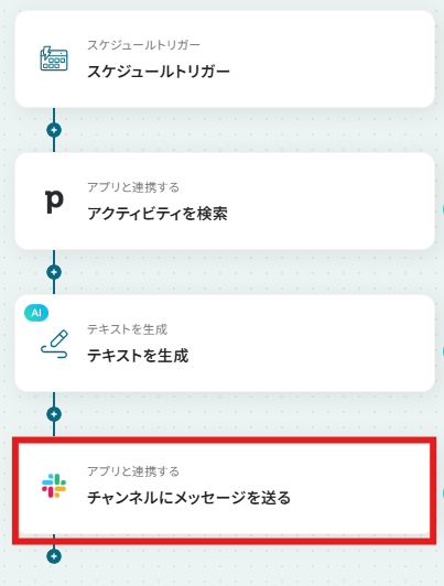 - 最後に、オペレーションでSlackの「チャンネルにメッセージを送る」アクションを設定し、生成されたメッセージを指定のチャンネルに通知します