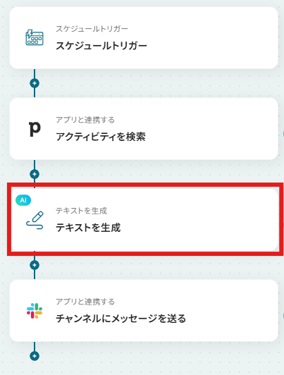 - Slackへの通知先チャンネルやメッセージ本文は任意で設定可能であり、本文にはPipedriveで取得したアクティビティの詳細や生成文を変数として埋め込めます