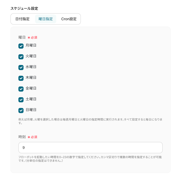 - スケジュールトリガーの設定では、フローを起動したい曜日や時刻などを任意で設定してください