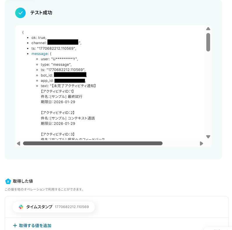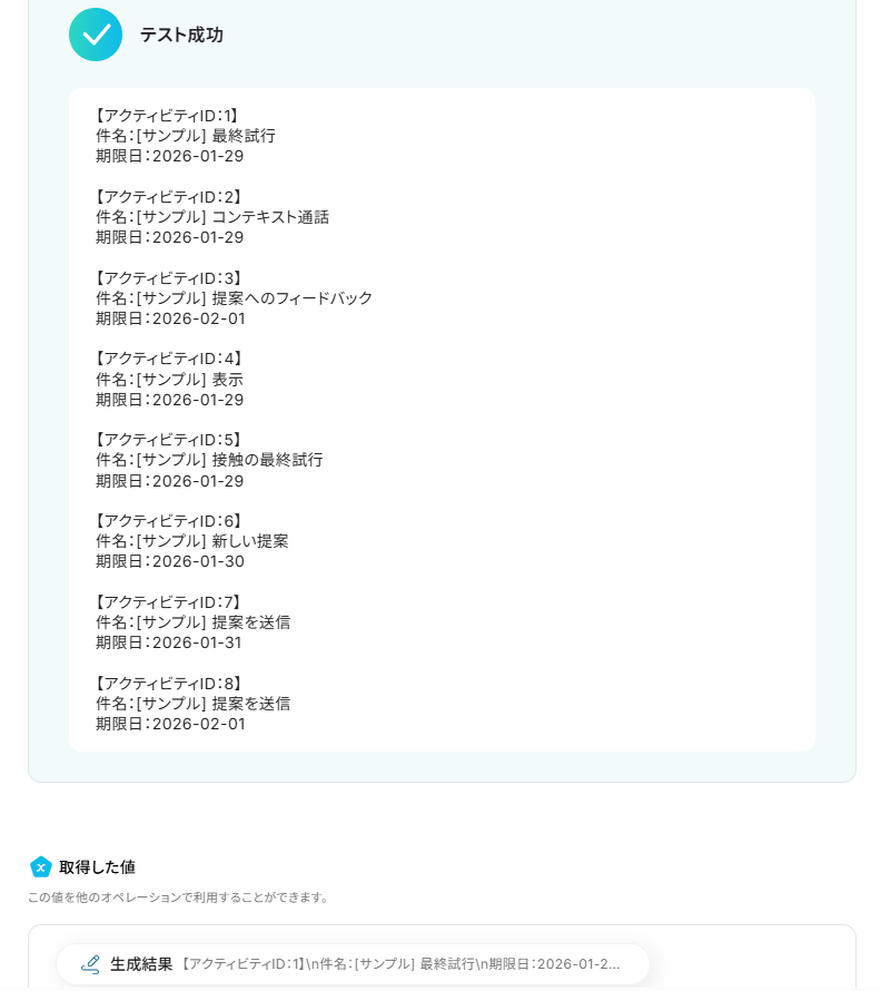 ここまで設定したらテストボタンをクリックしてください。テストが成功し、テキスト化された内容が取得した値に入ります。