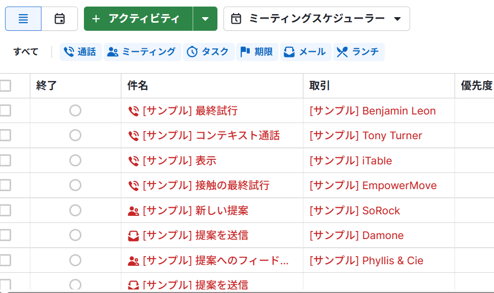 Pipedriveには以下のように未完了のアクティビティを登録しています。