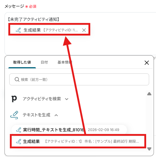 - 通知メッセージの本文は、固定のテキストだけでなく、Pipedriveから取得したアクティビティの件名や担当者名などの情報を変数として埋め込むことが可能です。