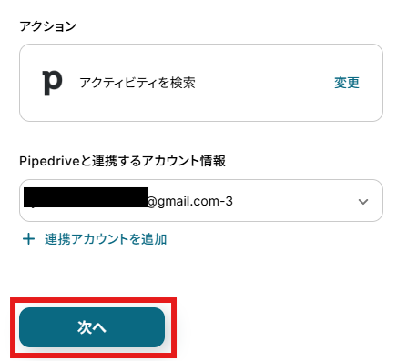 - 次に、オペレーションで、Pipedriveの「アクティビティを検索」アクションを設定し、未完了のアクティビティ情報を取得します