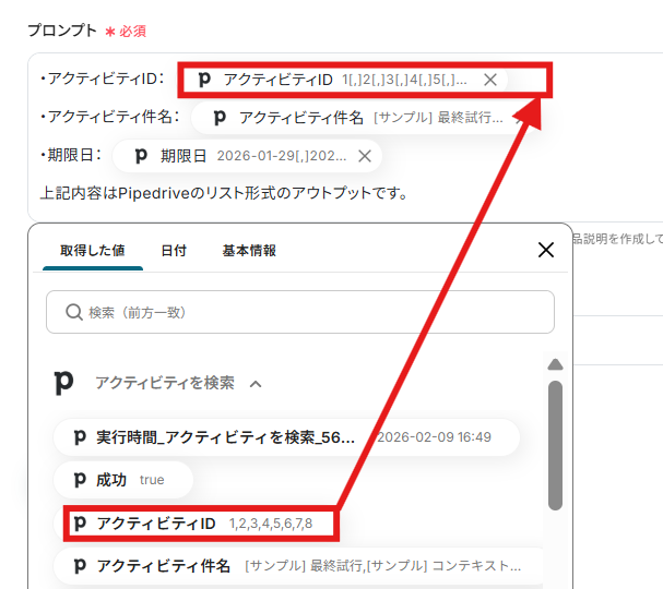 - Pipedriveでアクティビティを検索する際の条件は、特定の担当者や期間など、固定値や変数を用いて自由にカスタマイズが可能です