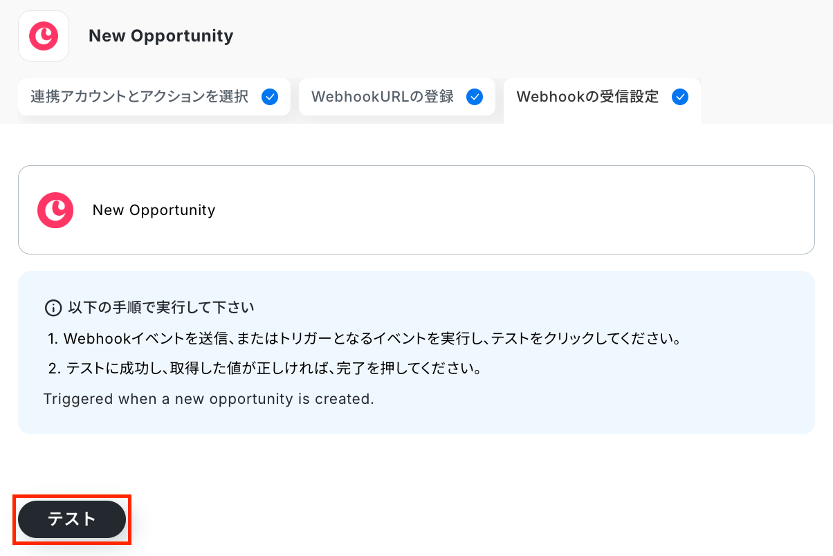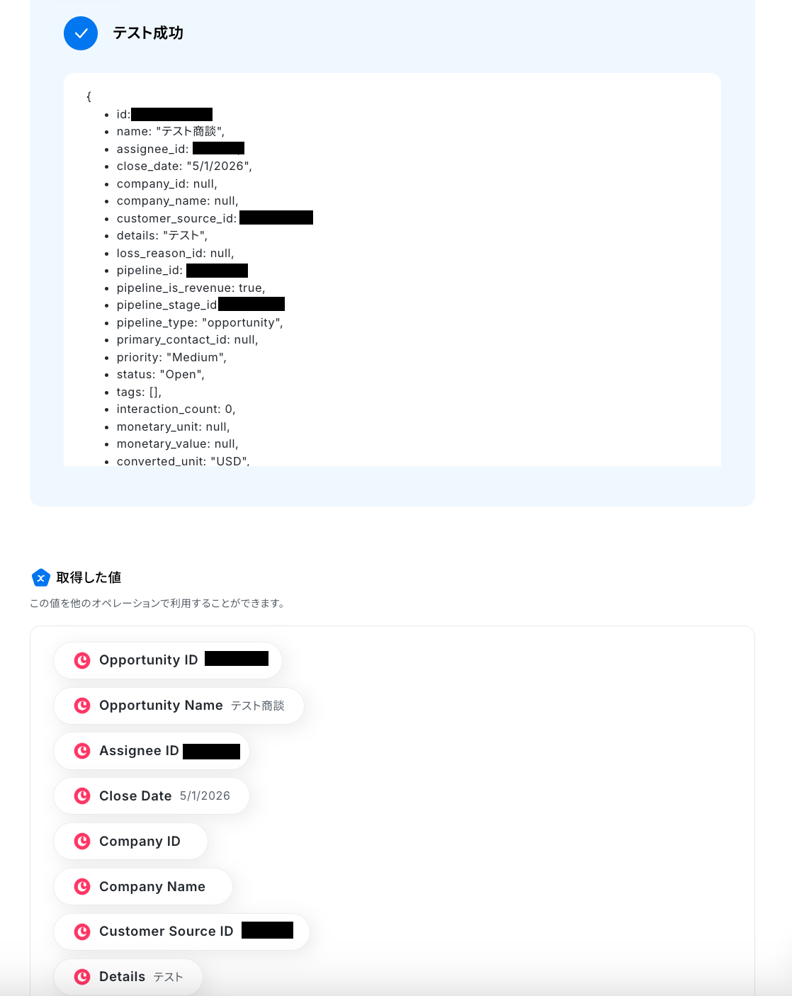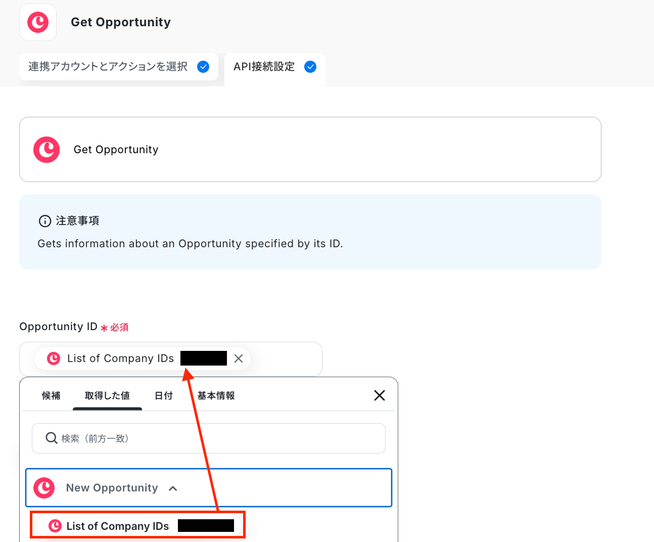 ここでは、新しく作成された商談情報の詳細を取得する設定を行います。