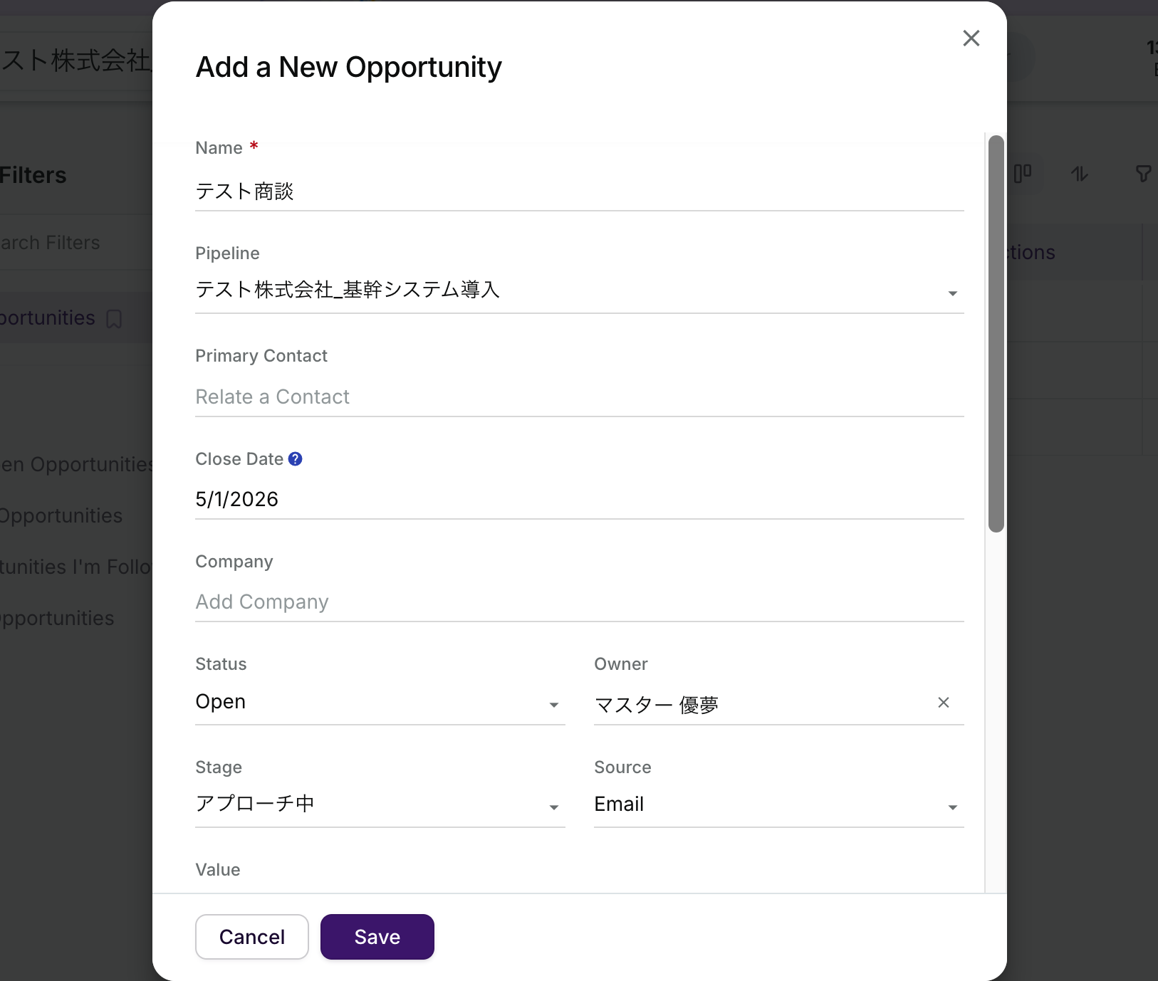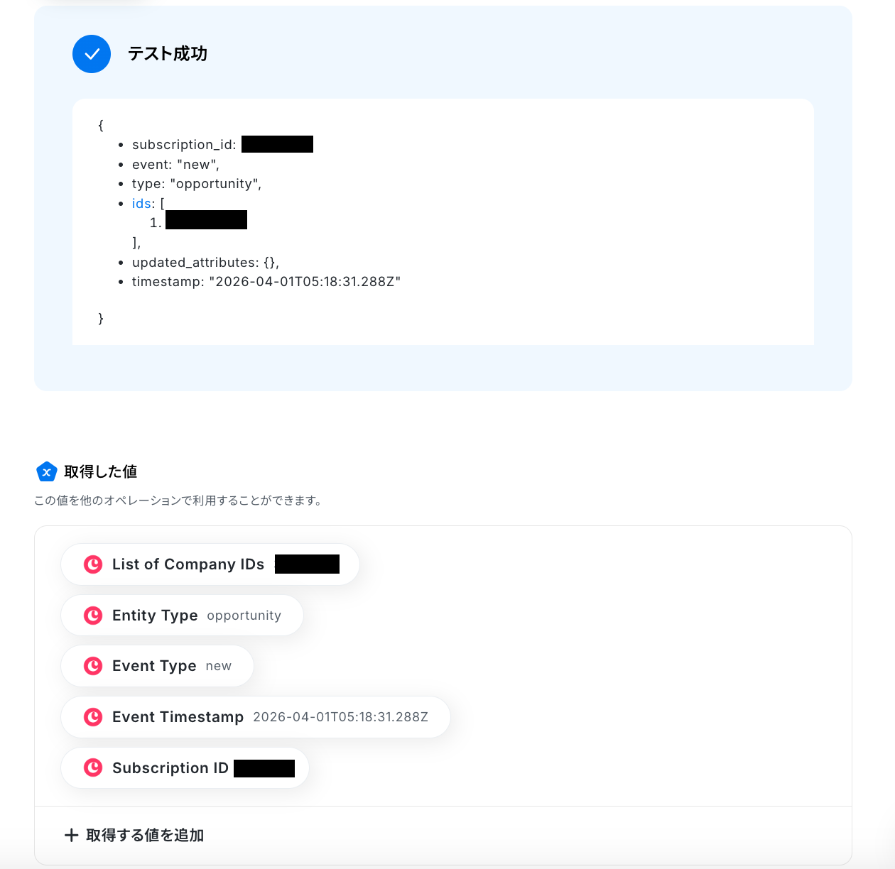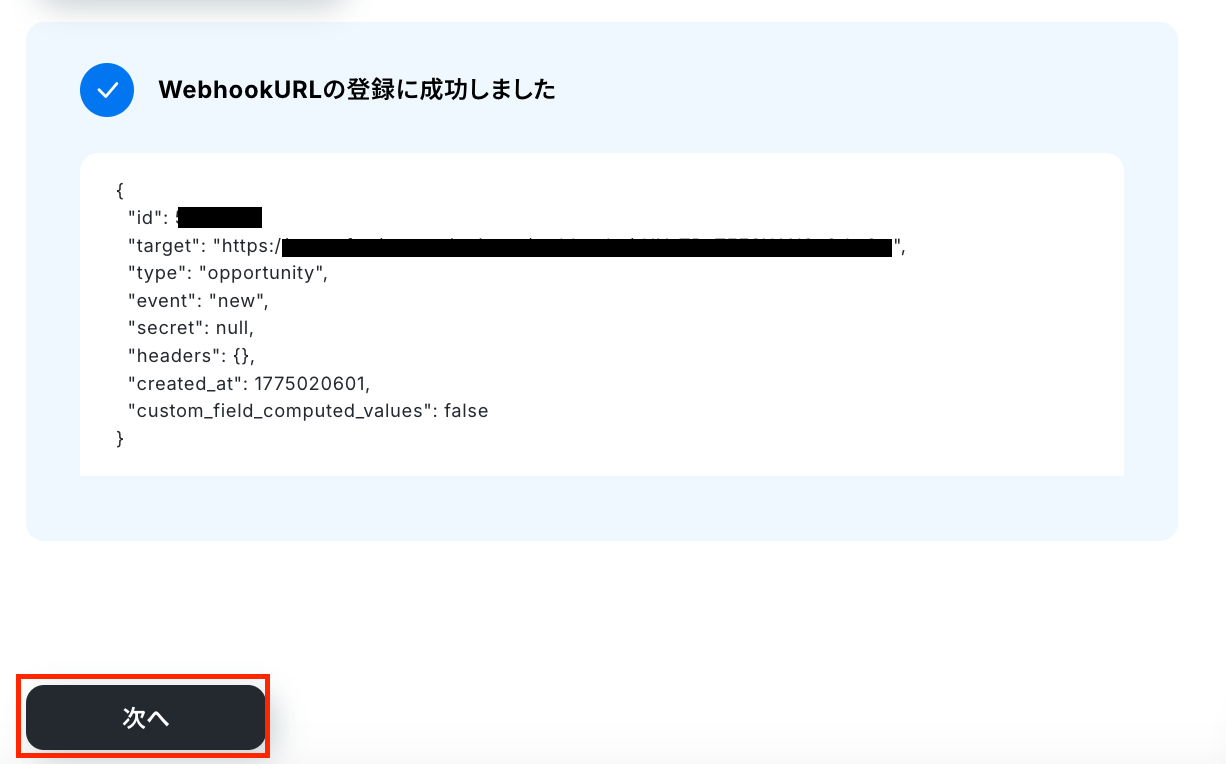 ここでは、新しく作成された商談情報の詳細を取得する設定を行います。