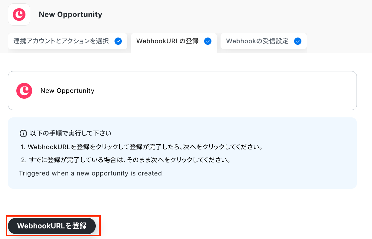 次の画面で手順を確認のうえ、「WebhookURLを登録」をクリックします。
