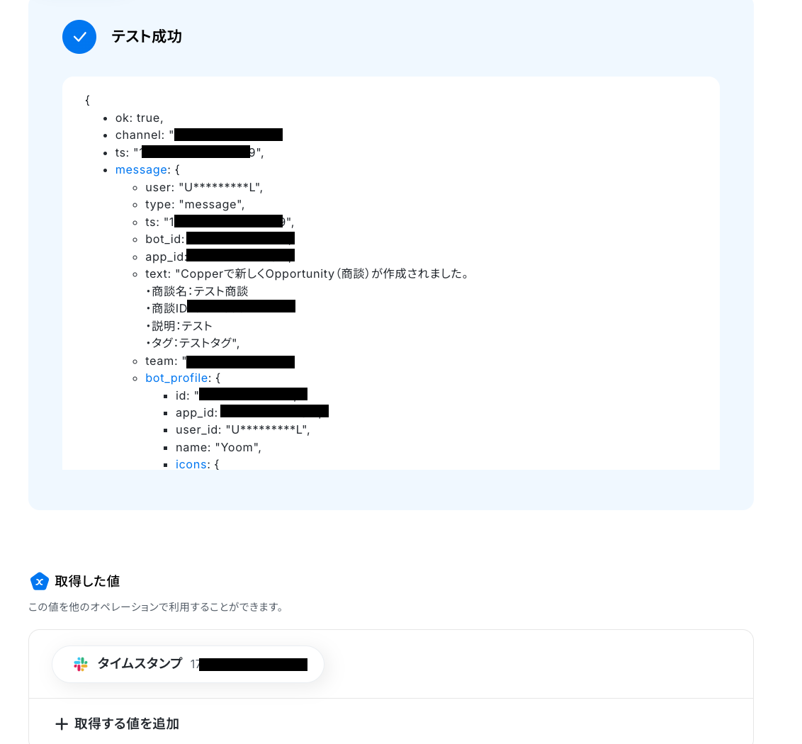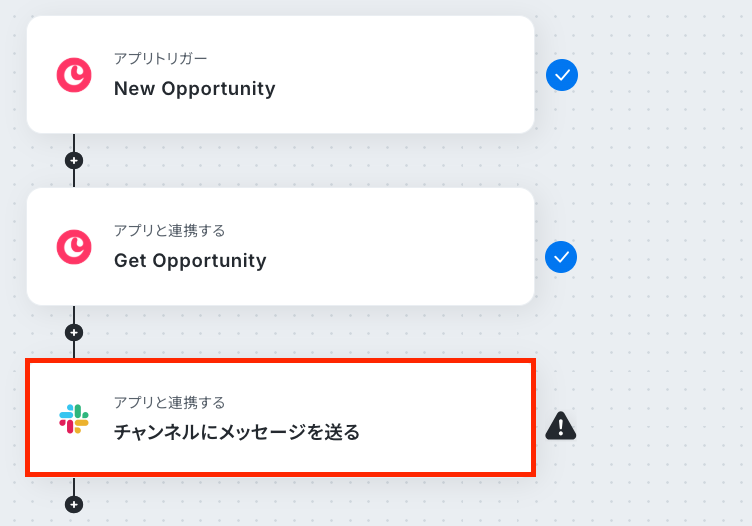 - 最後に、オペレーションでSlackの「チャンネルにメッセージを送る」アクションを設定し、取得したOpportunity情報を指定のチャンネルに通知します。