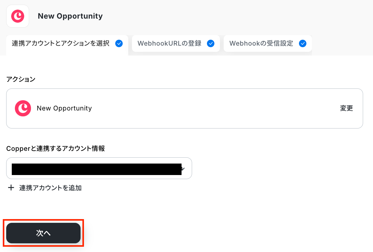 - 次に、トリガーでCopperを選択し、「New Opportunity」というアクション(新しいOpportunityが作成されたら)を設定します。