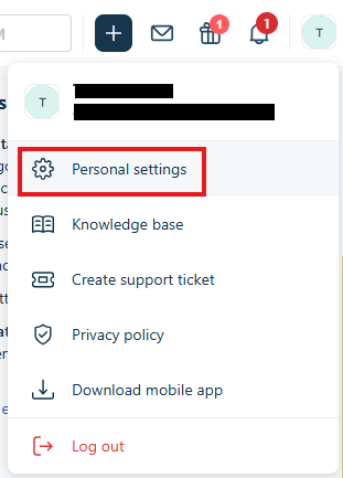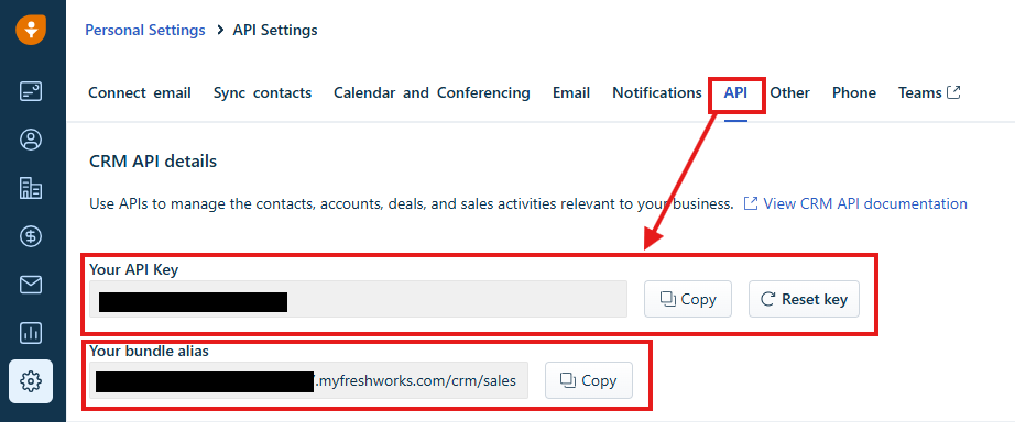 【Freshsalesのマイアプリ登録】 まず、FreshsalesからAPIキーとバンドルエイリアスを取得します。 Freshsalesを開いたら、右上のアイコンからPersonal Settingsを選択して、APIキーとバンドルエイリアスをコピーしてください。