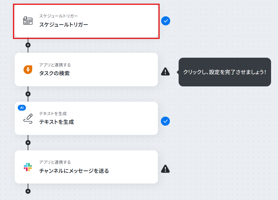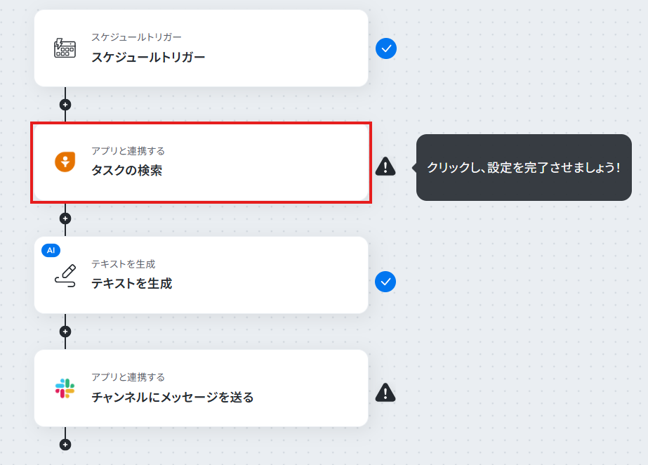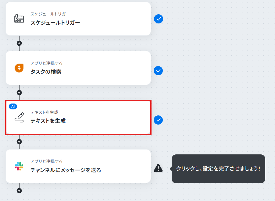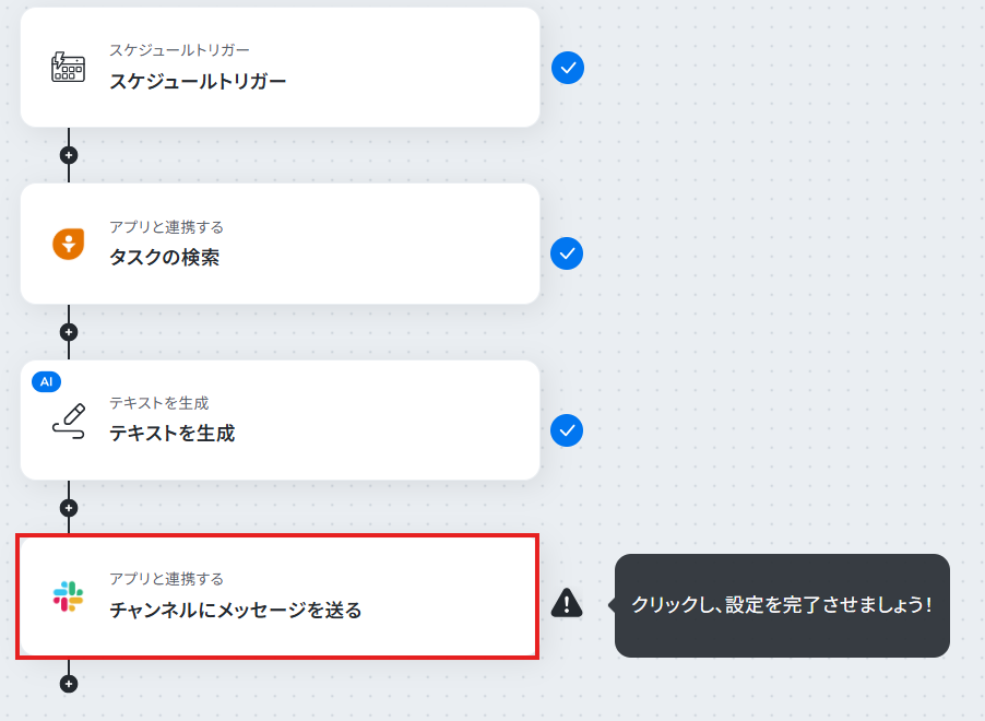 ステップ6:Slackのチャンネルにメッセージを送る設定 検索したタスク結果を踏まえ生成したテキストをSlackに送信するアクションを設定します。 「チャンネルにメッセージを送る」をクリックしてください。