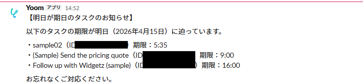 この場合、Freshsalesに「明日が期日のタスク」がない場合は、テスト用に作成しておいてください。