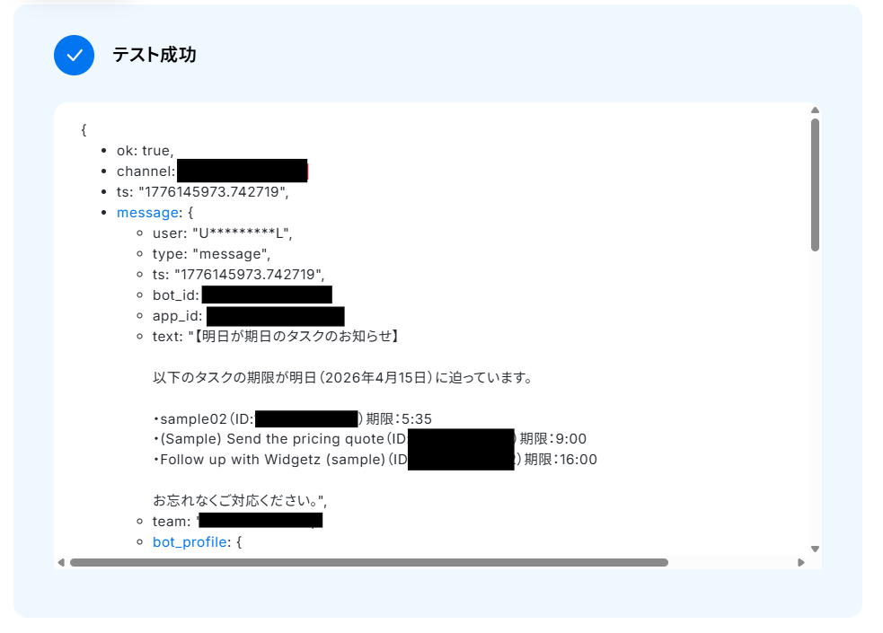 入力が完了したら、「テスト」をクリックします。テストが成功したら、Slackも確認してみましょう!