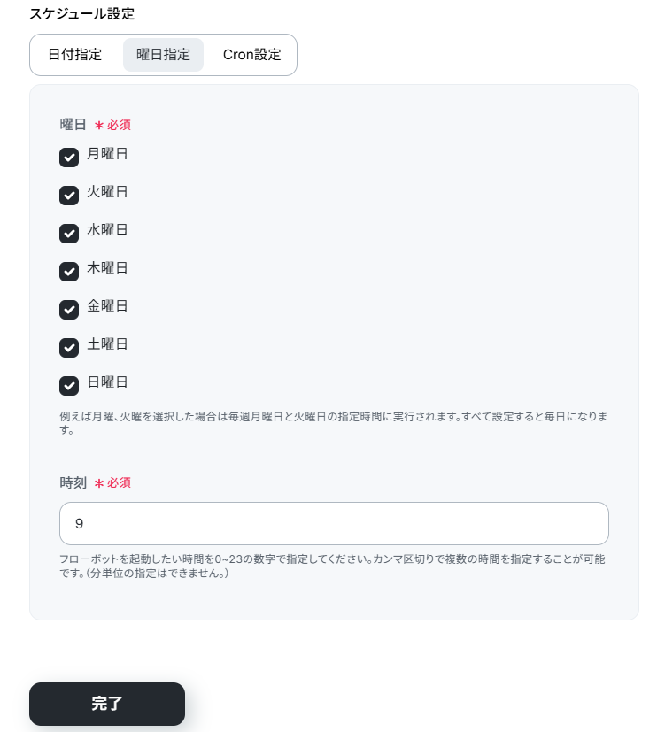 あらかじめ毎日9時に起動される設定になっています。 日付指定やCron設定 をすることもできます。希望にあわせて任意で設定してください。 詳しい設定方法については、下記よりご確認いただけます。