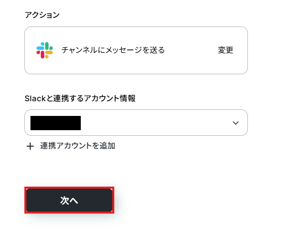 アクションは変更せず、アカウント情報がマイアプリ連携をしたアカウントと一致することを確認したら、次へ進みます。 なお、Slackにメッセージを送る際には、該当のチャンネルの「インテグレーション」からYoomを追加しておく必要があります。 以下を参考に、設定を済ませておきましょう。