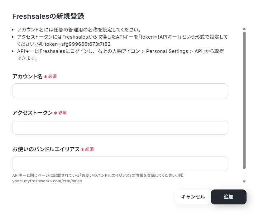 Yoomの操作画面に戻ります。 「マイアプリ」をクリックし、「新規接続」からFreshsalesを検索し選択すると以下の画面が表示されます。 脚注を参考にアカウント名を入力し、先ほどコピーしたAPIキー(アクセストークン)とバンドルエイリアスを貼り付けてください。 「追加」をクリックしたら、マイアプリ連携完了です。