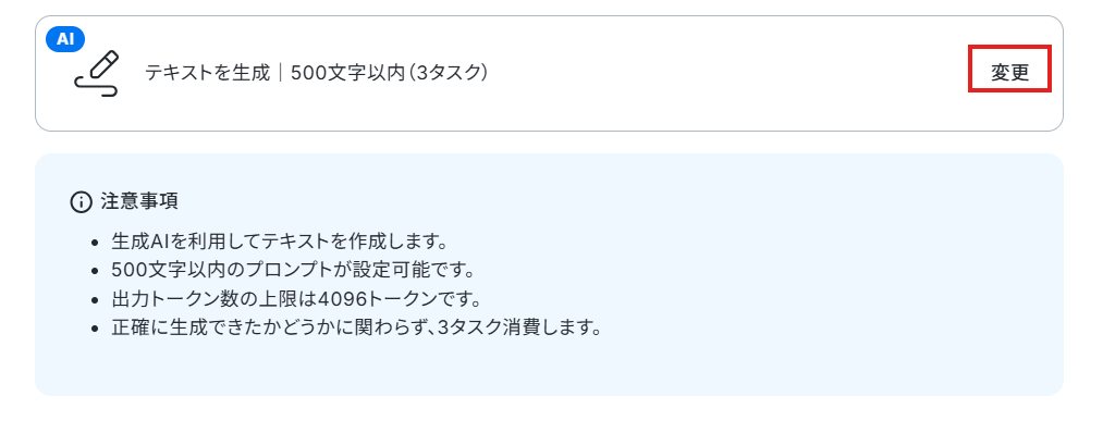 テキストを生成する変換タイプは「500文字以内(3タスク)」が設定されています。 「変更」から変更可能です。業務フローにあわせて変更してください。