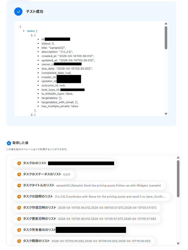 テストに成功すると、「取得した値」に情報が追加されます。