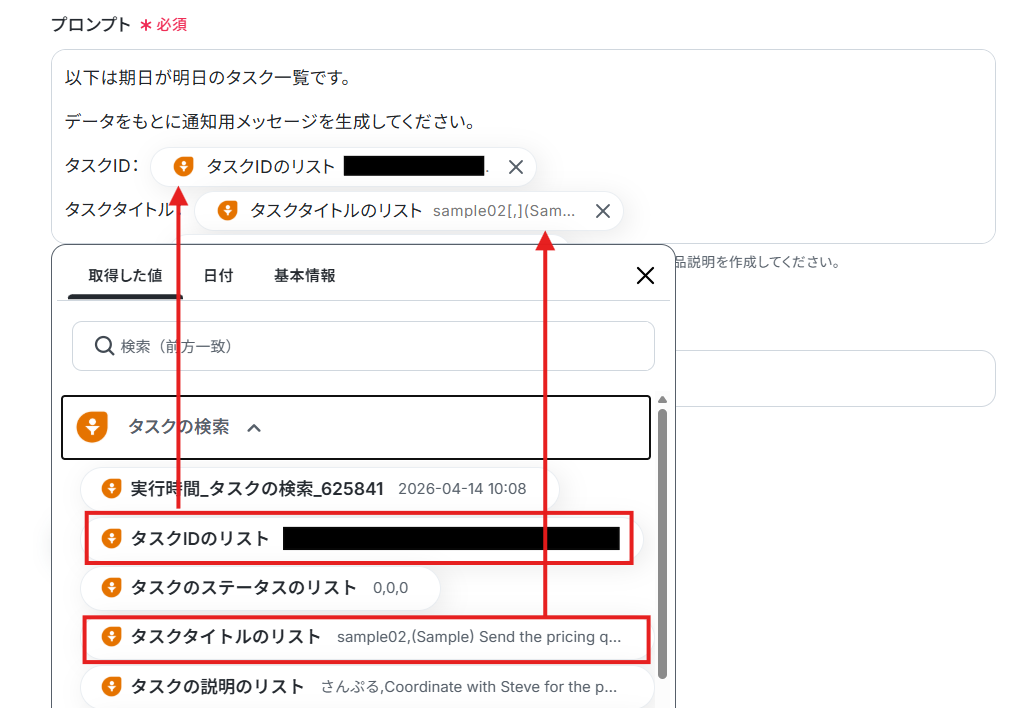 プロンプトは今回は以下のように「固定値」(テキストを直接入力した箇所)と「取得した値」を組み合わせて構成しました。 取得した値は、トリガー実行のたびに最新の情報が自動で反映されます。