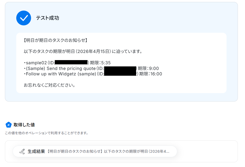 ステップ5のテキストを生成する設定で該当タスクが0件の場合にも対応できるように、プロンプトを追加していただければ該当タスクがない旨のメッセージを生成することができます。