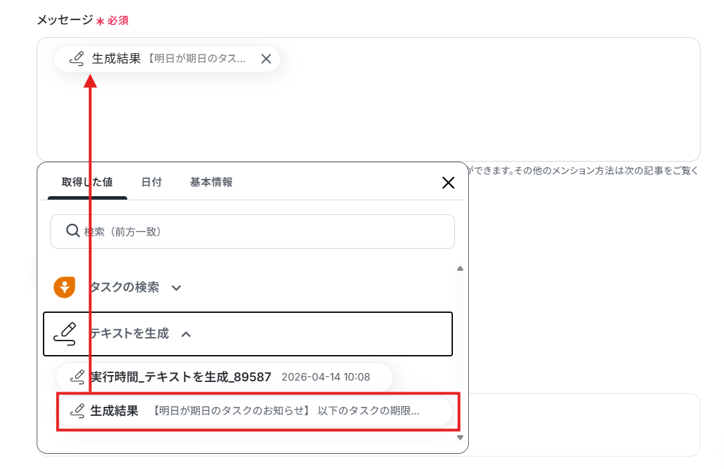 メッセージはテキスト生成で取得した値を設定しました。 デフォルトで設定されていますが、【←取得したアウトプットを使用して設定してください】という補足文は削除して設定してください。