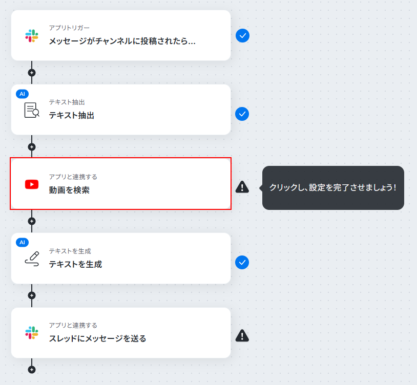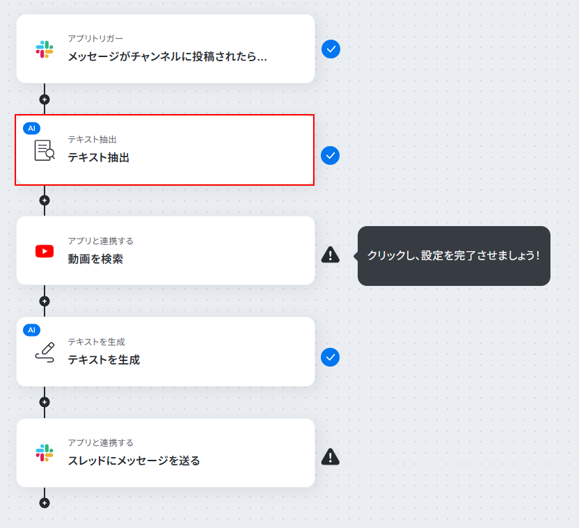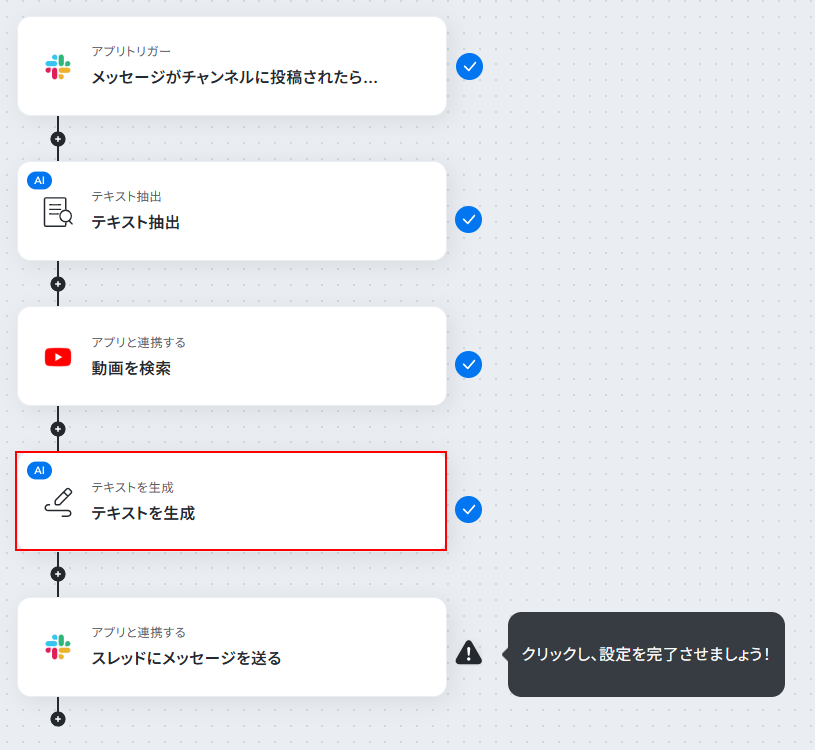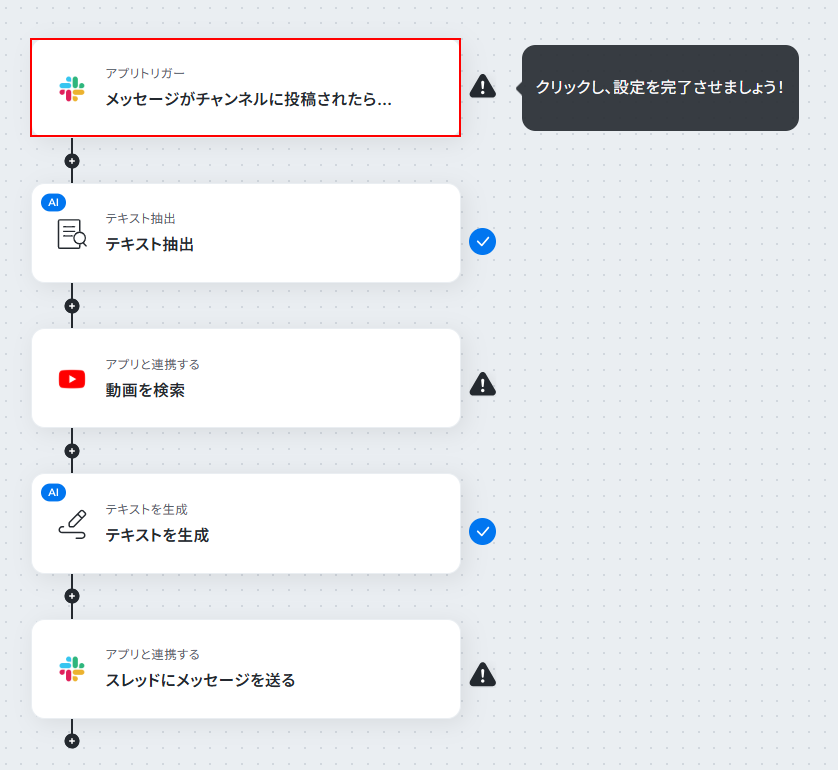 - Slackのトリガー設定とテキスト抽出、YouTube Data API、テキスト生成、Slackのアクション設定
