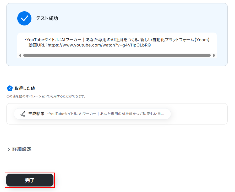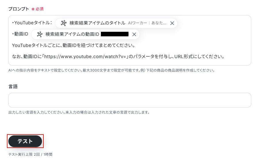 - YouTubeでの動画検索では、検索キーワードとして前段のAI機能で抽出した情報を変数として設定することが可能です。