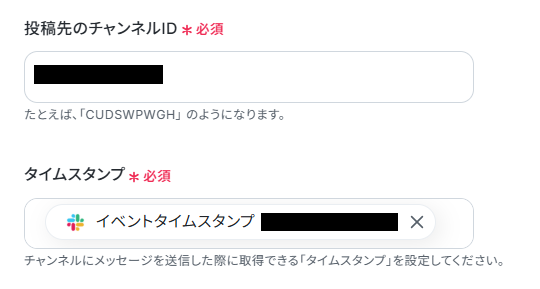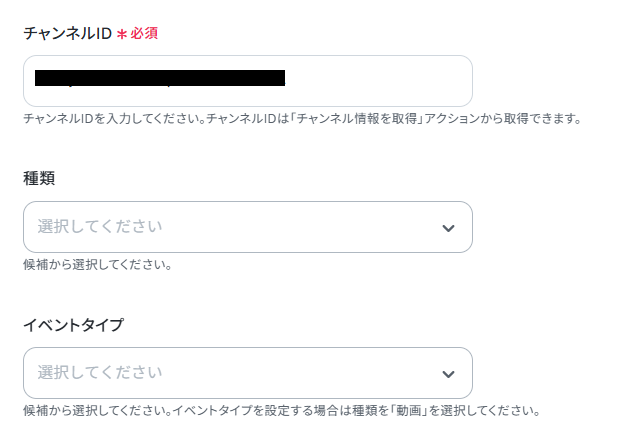 - Slackのトリガー設定では、対象のチャンネルIDやユーザーID、また「動画検索」といった特定のテキストを起動条件として任意で設定できます。