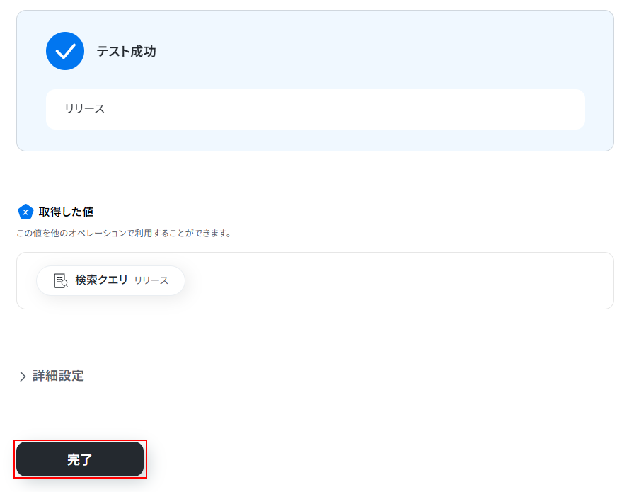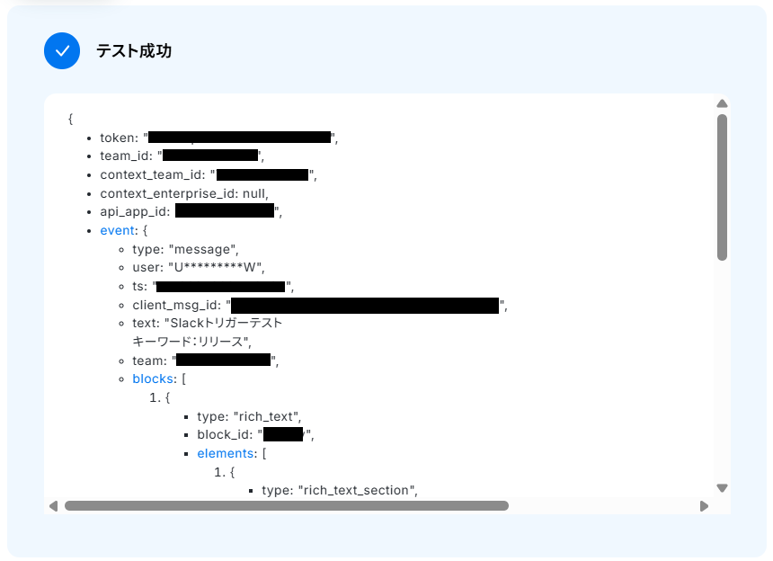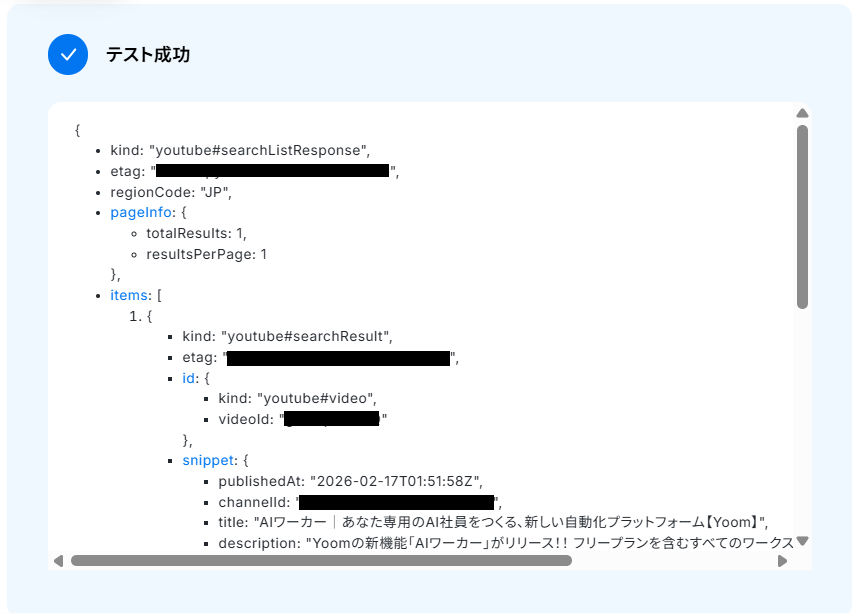テストに成功するとテスト成功画面と取得した値が表示されますので、抽出したい項目が表示されているかご確認ください。