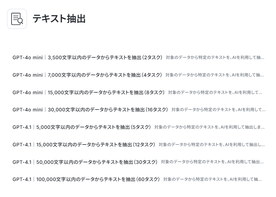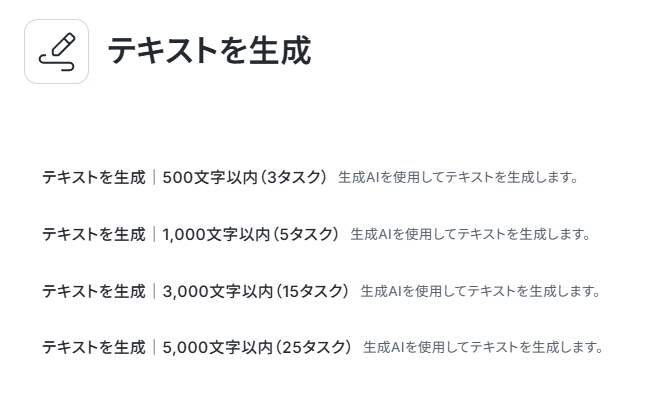 文字数やタスク数を確認し、利用したいものをお選びください。