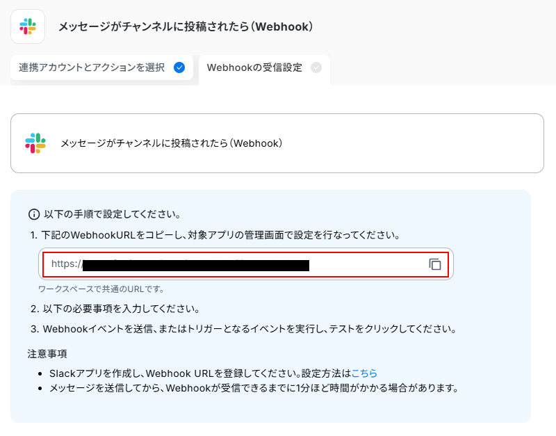 ※既にほかのフローボットでSlackのWebhookを利用している場合はそのまま利用できるため、設定する必要はありません。