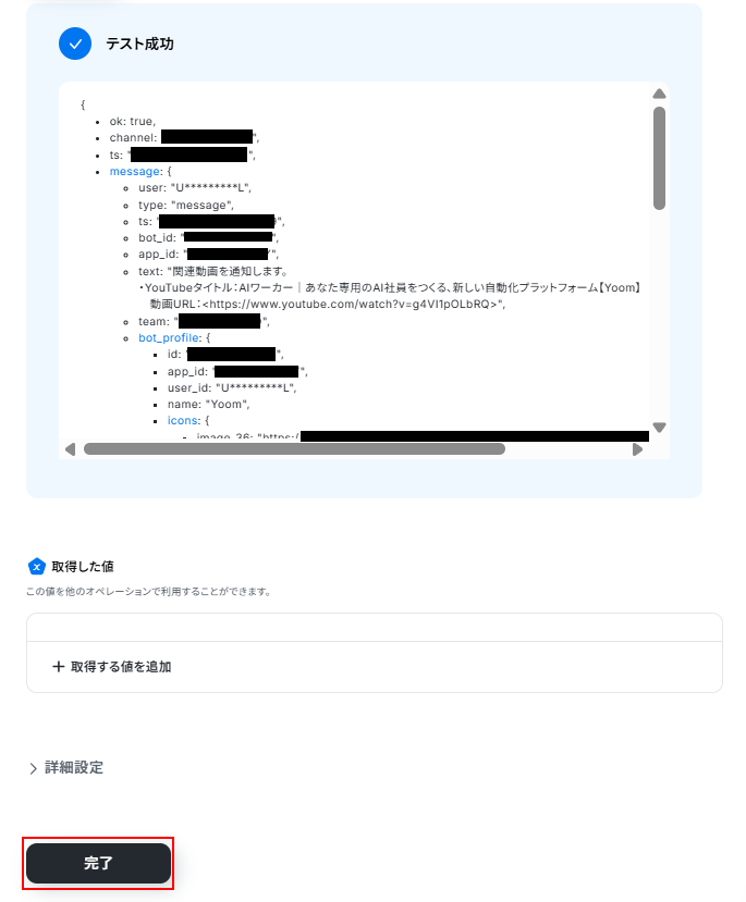 - Slackへのメッセージ送信では、メッセージ内容にYouTubeの検索結果などの前段で取得した情報を変数として含めることが可能です。