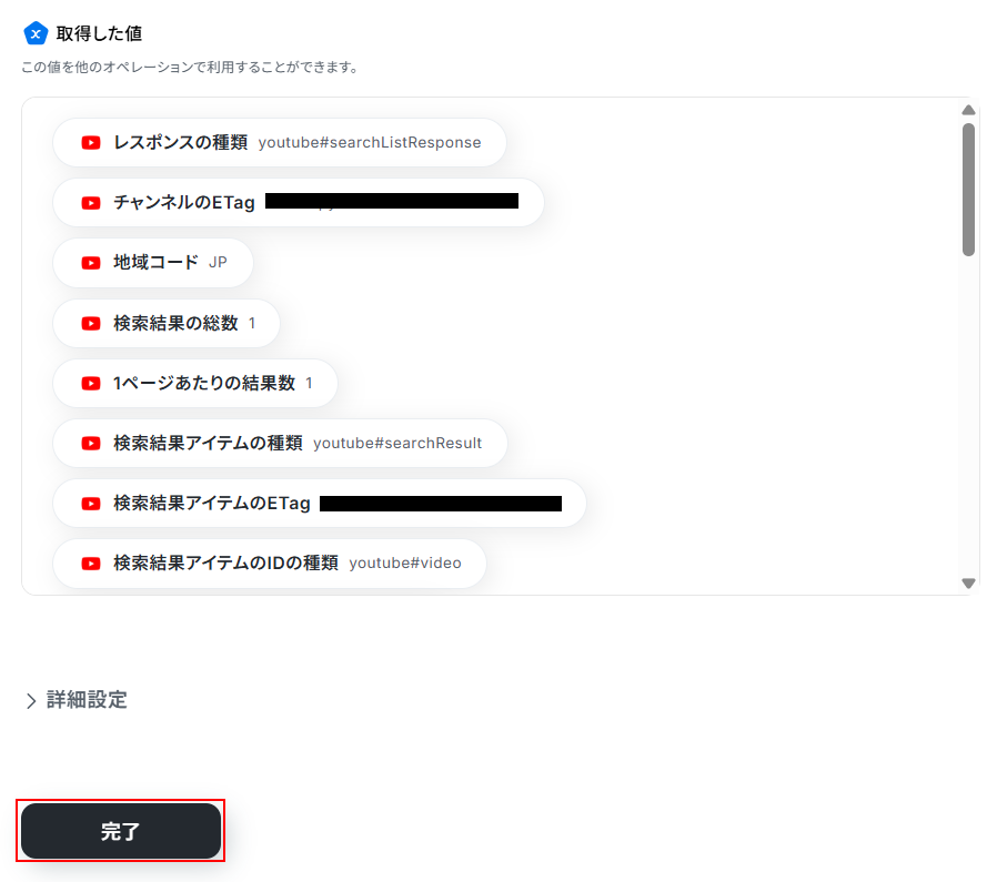 取得した値を利用することで、連携したアプリにYouTube動画の情報を自動で追加できます。