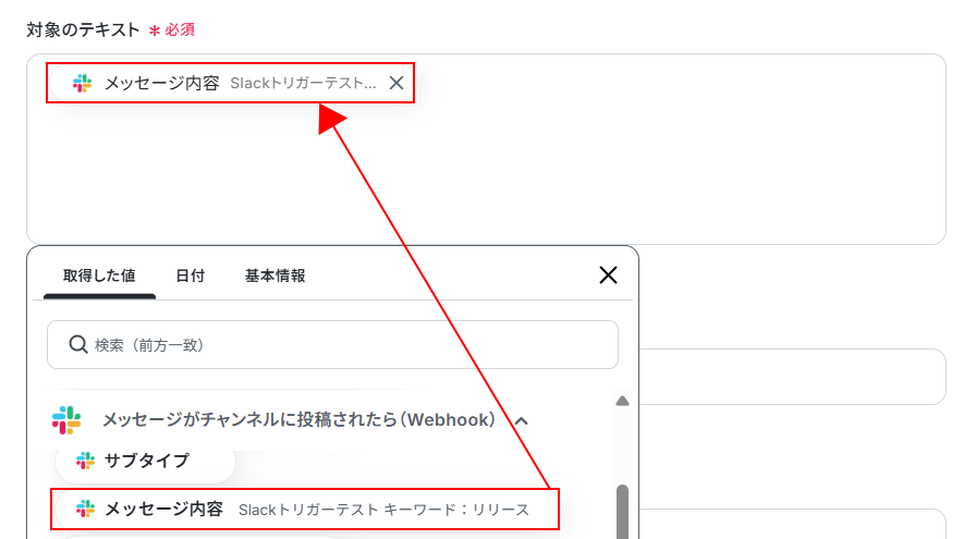 - AI機能のテキスト抽出では、Slackのメッセージ本文を変数として利用し、検索キーワードとしてどの部分を抜き出すかを自由に設定可能です。