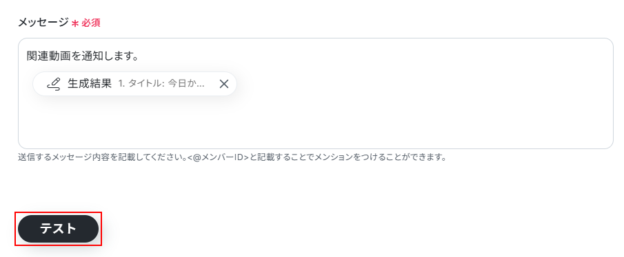 - 通知メッセージの本文は、固定のテキストを設定できるだけでなく、トリガーで取得したYouTube動画のタイトルやURLといった情報を変数として埋め込み、内容をカスタマイズできます。