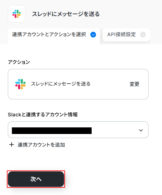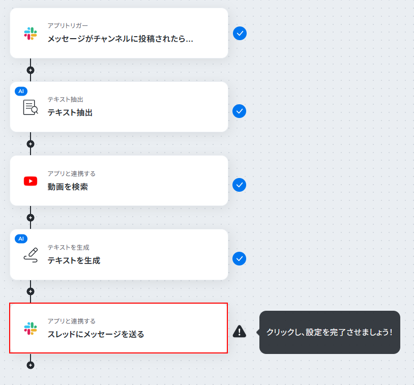- 最後に、オペレーションでSlackの「スレッドにメッセージを送る」を設定し、生成したメッセージを元の投稿に返信します。