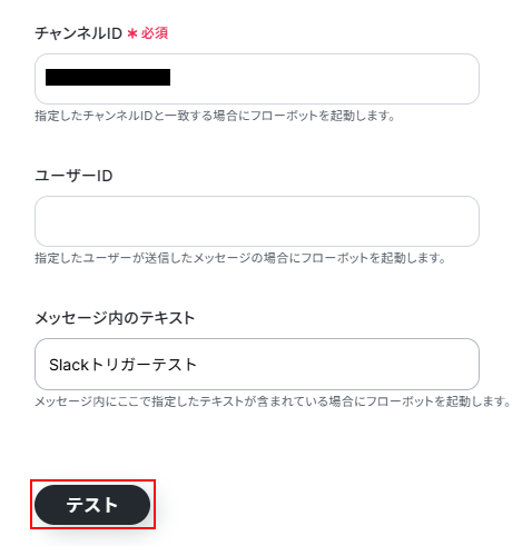 例えばテストだけだと、テストを含むメッセージが投稿された際にフローボットが起動してしまいますのでご注意ください。