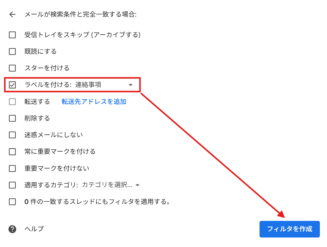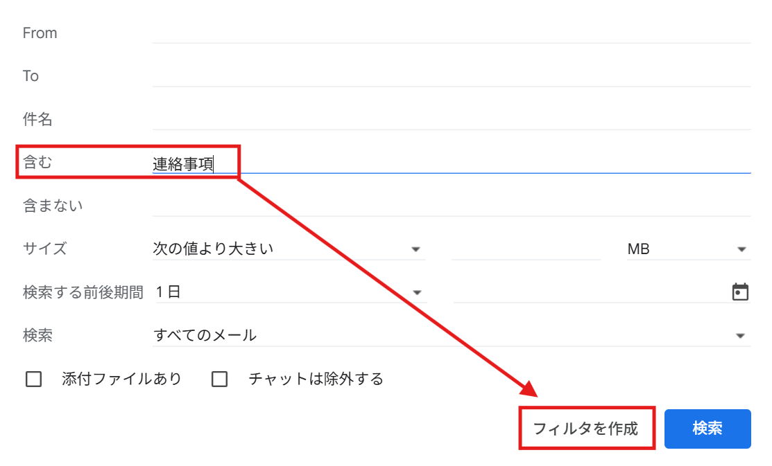 画像のマークをクリックし、「連絡事項」を含むメールを条件にフィルタを作成します。