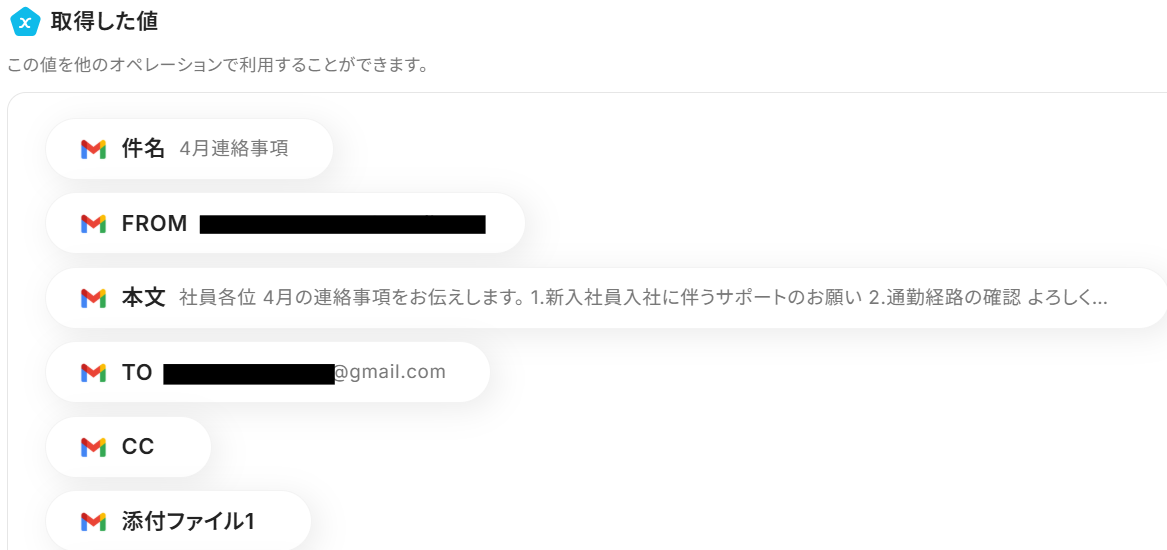 このアウトプットをこのあとのアクション設定時に引用することで、GmailとGoogle Chatのデータ連携を実現していきます!