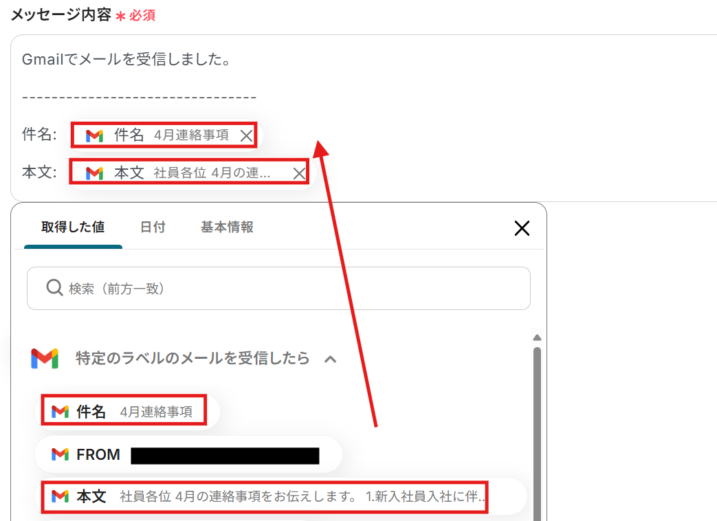 件名などを手打ちで入力してしまうとそれが毎回通知されてしまうため、項目名以外のトリガーから取得した項目は必ずアウトプットから選択してください。