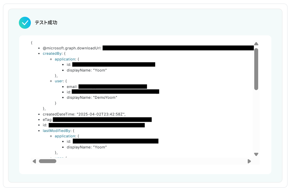 格納後、Yoomの画面に戻って「テスト」をクリックします。テストが成功すると、以下の画面が表示されます。