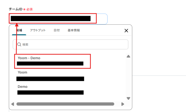 OneDriveのファイルデータを通知する、「チームID」を候補から選択しましょう。