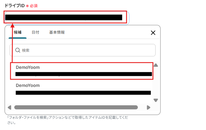 「ドライブID」欄をクリックすると、連携しているアカウントから候補が表示されます。