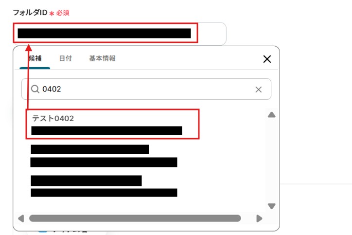 フォルダIDをドライブID同様に、候補から選択しましょう。