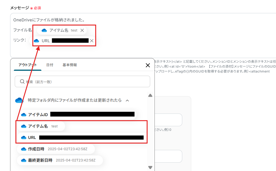 「OneDriveにファイルが格納されました。」など、毎回同じテキストを使用する部分は定型文として固定値で入力し、「アイテム名」や「URL」など、OneDriveのデータを引用する部分はアウトプットを用いて入力しましょう。