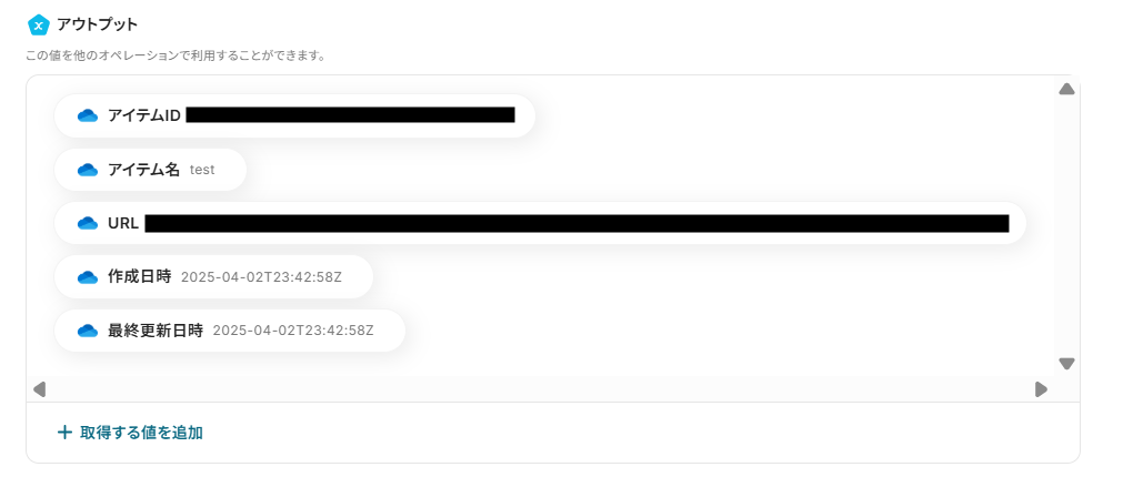 格納したファイル情報が、アウトプットとして取得できます。