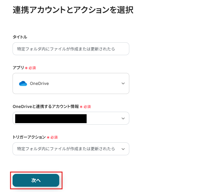 連携するアカウント情報を確認し、「次へ」をクリックします。