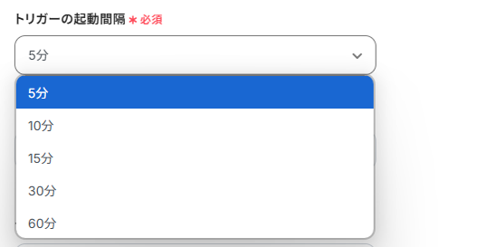 トリガーの起動間隔は、5分、10分、15分、30分、60分から選択できますが、基本的にはご利用中のプランの最短の起動間隔に設定することをおすすめします。