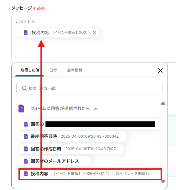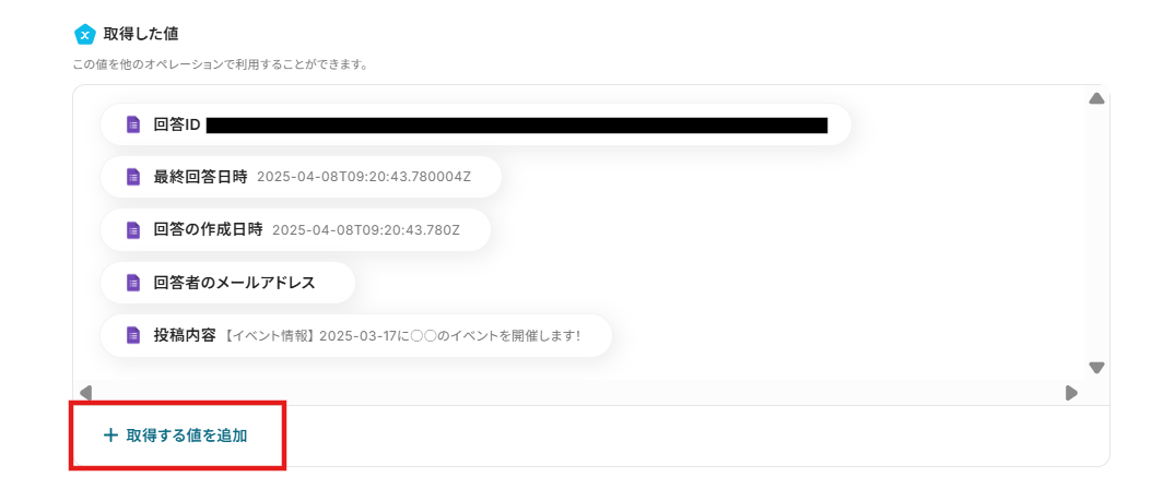 ・Googleフォームをトリガーとして使用した際の回答内容を取得する方法は下記を参照ください。